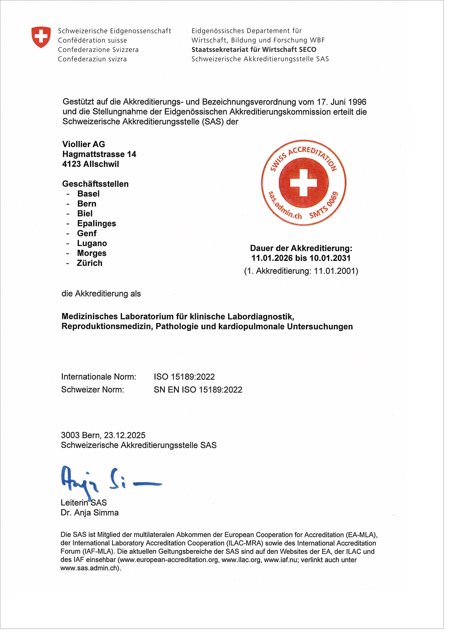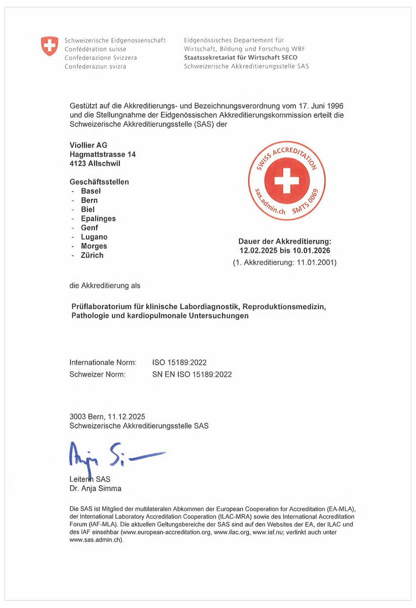 Viollier verpflichtet sich zur Einhaltung der internationalen Norm SN EN ISO 15189 ‘Medizinische Laboratorien – Anforderungen an die Qualität und Kompetenz‘. Dies wird durch die wiederkehrenden Audits der Schweizerischen Akkreditierungsstelle SAS (SMTS 0069) überwacht. Diese externe Bestätigung der Fachkompetenz bedeutet für Kunden und Patienten, dass alle labormedizinische Prozesse dem neuesten Stand der Wissenschaft und Technik entsprechen.